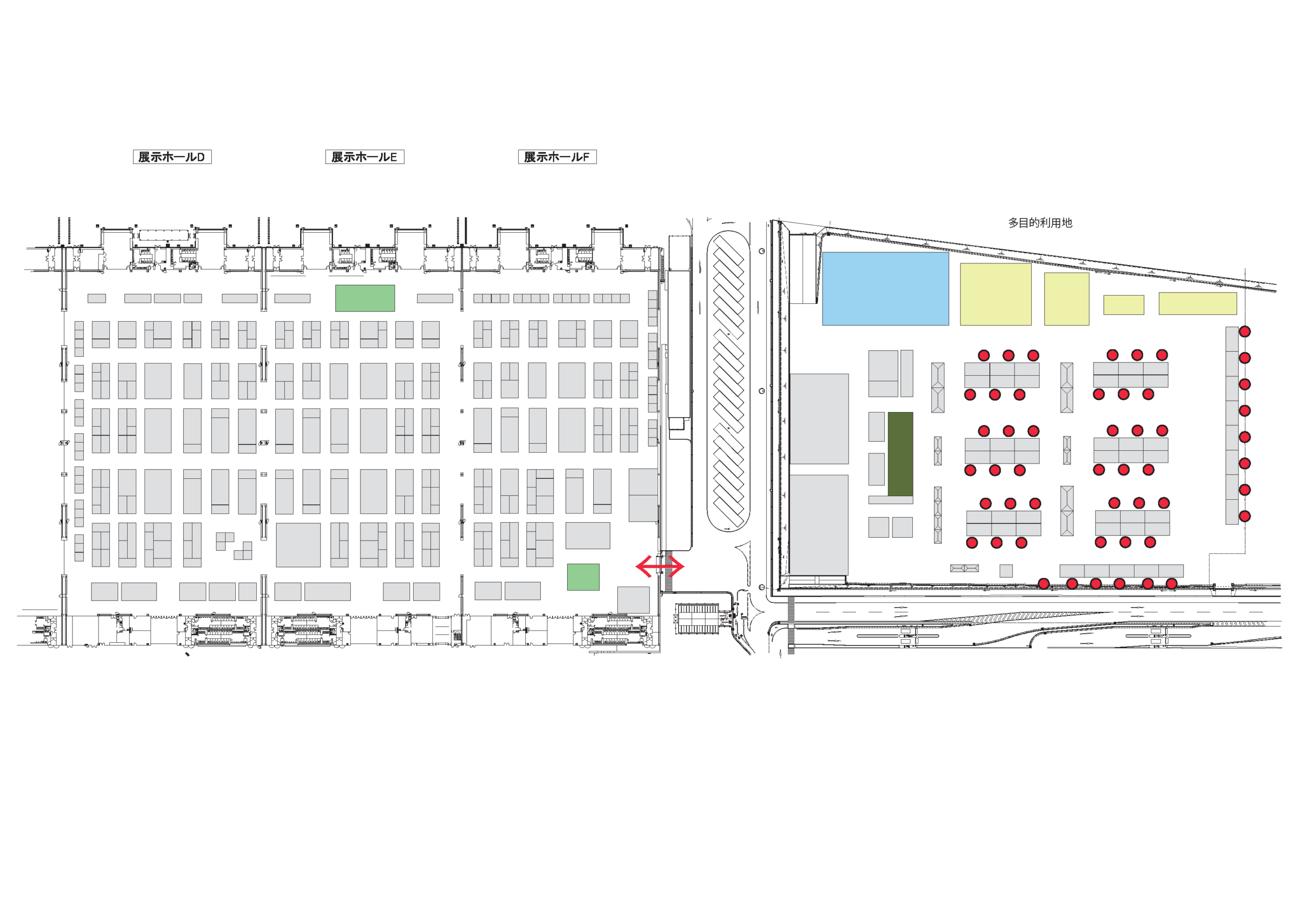 Halls B through F can be used either as a single integrated space or as individual halls, offering flexible layouts ranging from 10,000 to 50,000 m².