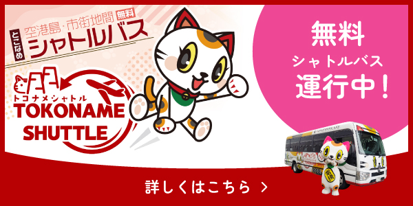 The convenient free shuttle bus “TOKONAME SHUTTLE” is available every day, offering direct service from Aichi Sky Expo (Aichi International Exhibition Center) to downtown Tokoname!